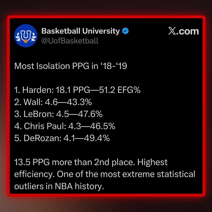 18-19赛季的哈登场均单打得分18.1分,有效命中率51.2%;而第二名的约翰·沃尔仅4.6分,命中率43.3%!