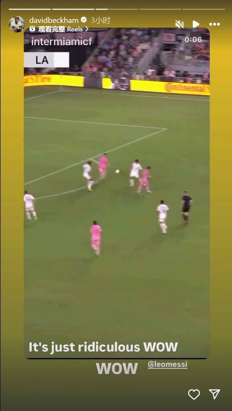 迈阿密国际老板贝克汉姆更新社媒动态,转发梅西脚后跟妙传助攻的视频,配文:“这简直不可思议,哇!”