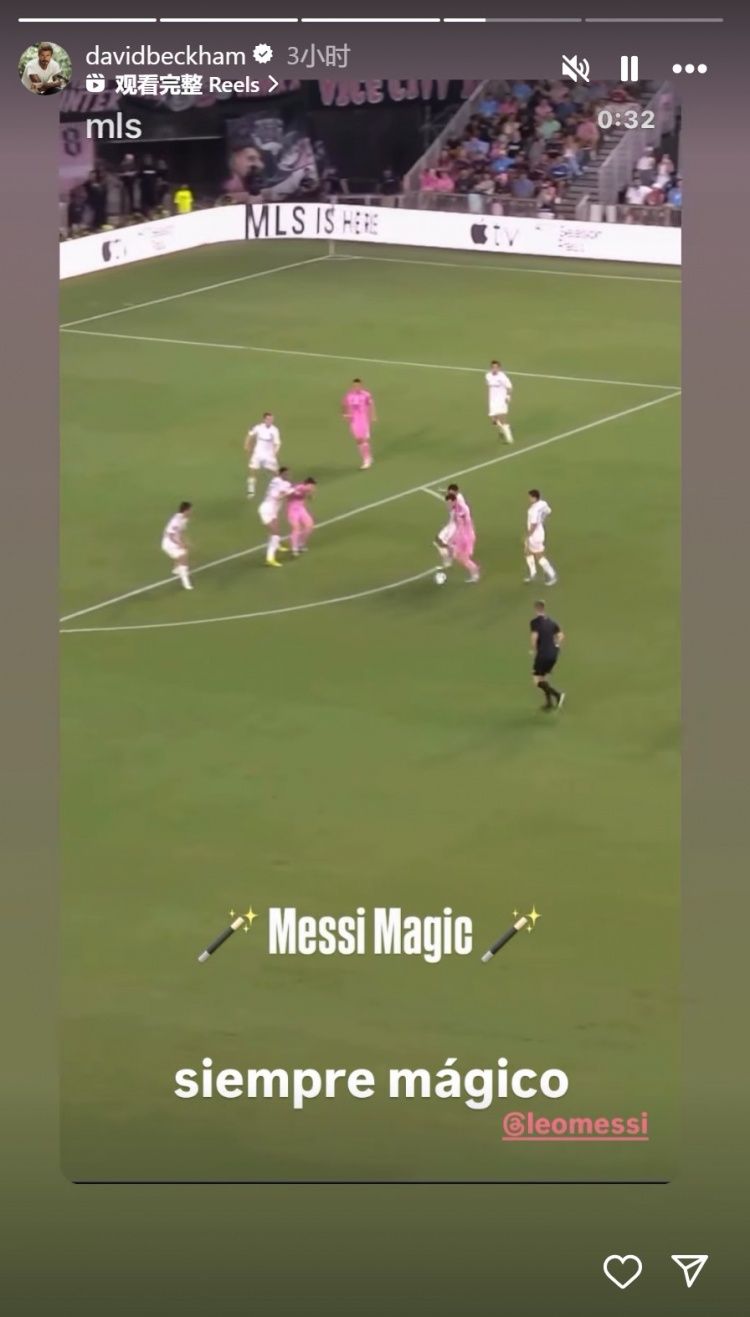 贝克汉姆还转发梅西远射破门的视频,配文:“梅西魔法。永远充满魔力。”